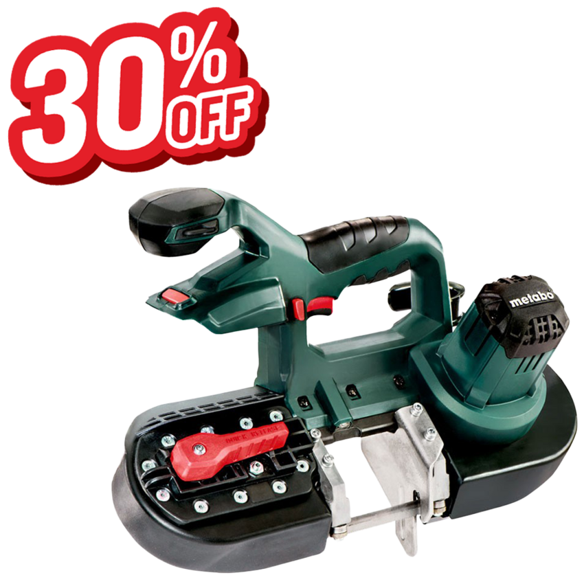 Light cordless band saw for precise, burr-free cuts in metal, aluminum, and plastic • Compact design for sawing in hard to reach places and overhead • Material-friendly, almost spark-free sawing without coolant • Low-fatigue working thanks to optimum center of gravity and large rubberized areas of the handles • Low-vibration saw blade running for precision cuts and comfortable working • Adjustable blade tension • Metabo Quick for changing saw blades without tools • Integrated LED work light for illuminating the cutting line • Robust housing with solid metal stop and metal saw blade cover • Integrated hanging hook for space-saving storage • Conventional band saw blades in the respective size can be used • Ultra-M technology for the highest performance