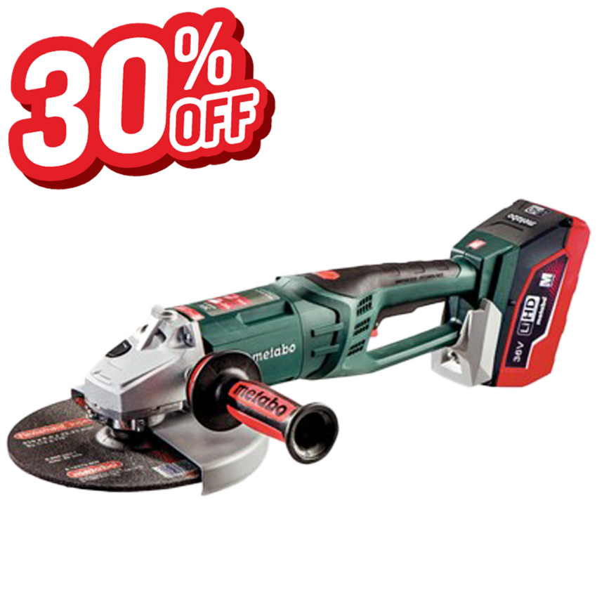 The world's largest angle grinder (Ø 9") with battery operation for powerful separating and roughing independent of a power source • 100% compatibility to 18-volt class: powerful 36 volt mode with two 18 volt battery packs from Metabo • Wide range of uses due to an extremely high cutting depth of 3" • Unique encapsulated Metabo brushless motor with optimum protection from dust provides quick work progress and the highest efficiency for any application • Deadman switch for high user protection • Quick braking system for the highest level of User Safety stops the disc in seconds after switching off • Swiveling main handle: High safety and better handling when cutting • Metabo VibraTech (MVT) side handle for vibration damping to protect the user's health • Side handle can be mounted in three positions • Electronic safety shutdown of the motor reduces kickback if the disc stops unexpectedly- for high user protection • Overload protection, soft start and restart protection